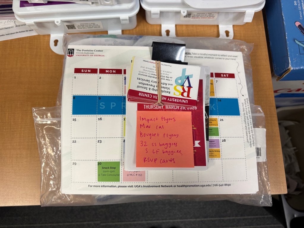Summary: On Wednesday, I gathered some materials for a class presentation that Aspen was presenting. These items included some sexual health bags, flyers for upcoming events, RSVP information cards, and calendars for the month of March. Helping to prepare these materials is not only helpful for Aspen but also a small and quick task that I can complete while in office.